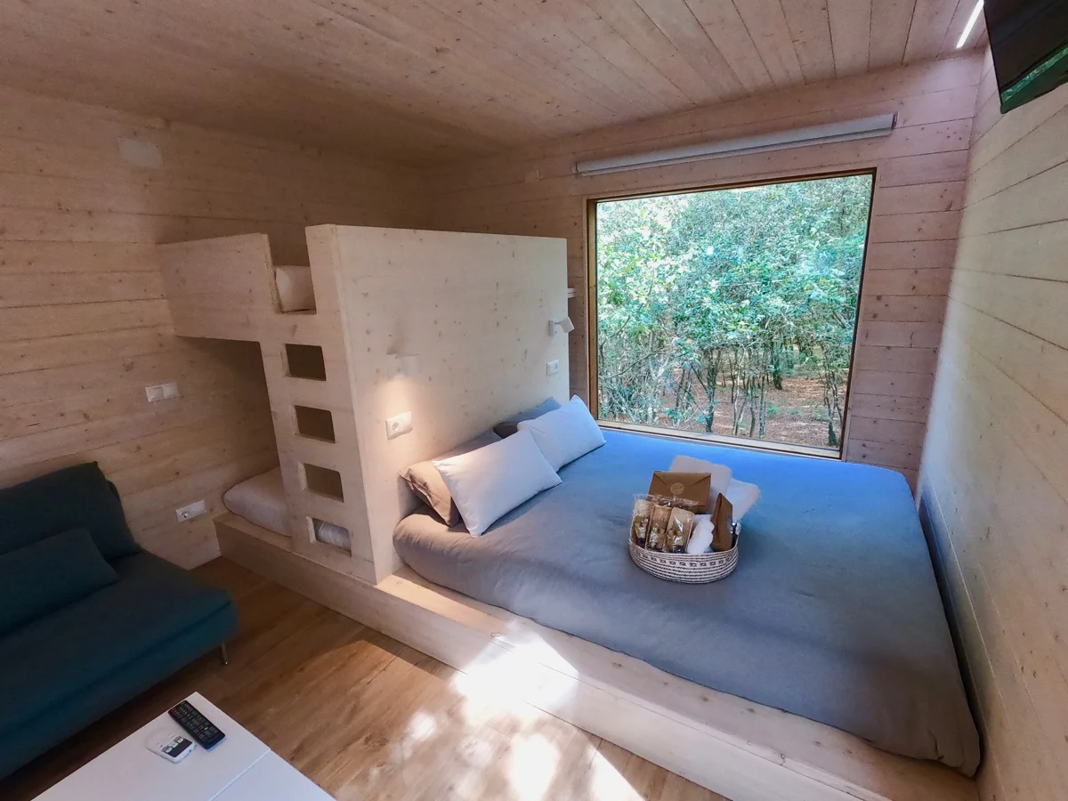 El espacio interior, de 24 m² integra cocina, dormitorio con cama de 1,60 cm, salón con sofá cama y baño.